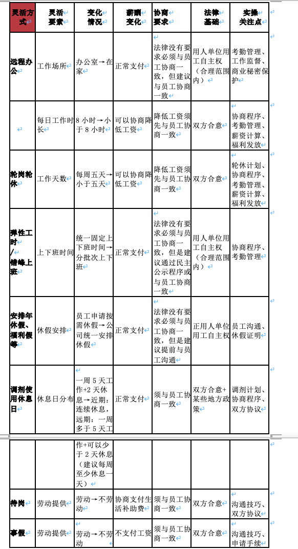 “灵活”是“固定”的反义词,那么“灵活用工”的对立面一般是指常规的、固定的用工状态,例如周一至五工作、周六日休息,早上九点上班、下午六点下班等等。“灵活用工”就是打破常规,产生变化。笔者以灵活的不同要素为出发点,针对标准工时制的员工, 将企业在疫情防控期间可以适用的灵活用工方式归纳如下表: