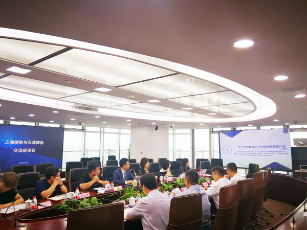 2020年8月26日上午,天津市律师协会副会长牛同栩、律所建设指导委员会副主任刘朔、惩戒委员会副主任王轶、行业规则委员会副主任姚丹、行业发展委员会委员王丽婷、监事李克强、秘书处会员部窦沛然一行7人来访上海律协。上海律协副会长陈峰、理事、律所规范与发展委员会主任吴坚、规划与规则委员会主任黄荣楠、纪律(惩戒)委员会副主任杭炜、公共关系部主任金鹰等接待了天津律协考察团一行并交流座谈。