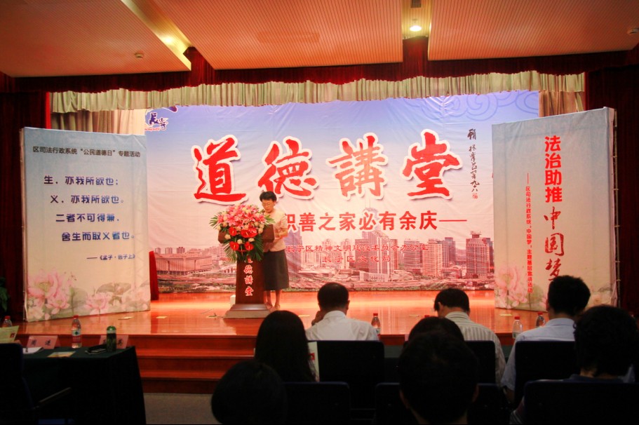 9月24日上午,为庆祝全国第十一个“公民道德日”,结合“中国梦”主题群众性基层宣讲活动和“第三届上海市好心人节”主题活动,区司法局联合区文明办、文化局共同举办区司法行政系统“法治助推中国梦”专题道德讲堂活动。地点设在位于长宁区图书馆的区道德讲堂总堂,主持活动的是上海海耀律师事务所周若蒙律师。出席的领导有区司法局党委书记王军、区文明办副主任符雪峰等,参加人员还有区文明办部分同志,局系统13家市区级文明单位代表,局机关和法律援助中心全体人员,各基层党组织党支部书记和党务助理,区众扶协会、人民调解协会、新航社工站代表以及东虹桥法律服务园区党员代表共计一百余人。