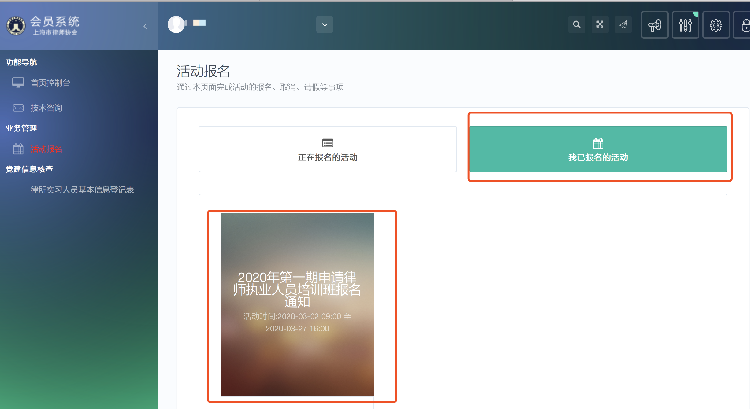 2、点击“已报名活动”,选择“2020年第一期申请律师执业人员培训班”,点击“缴费”;