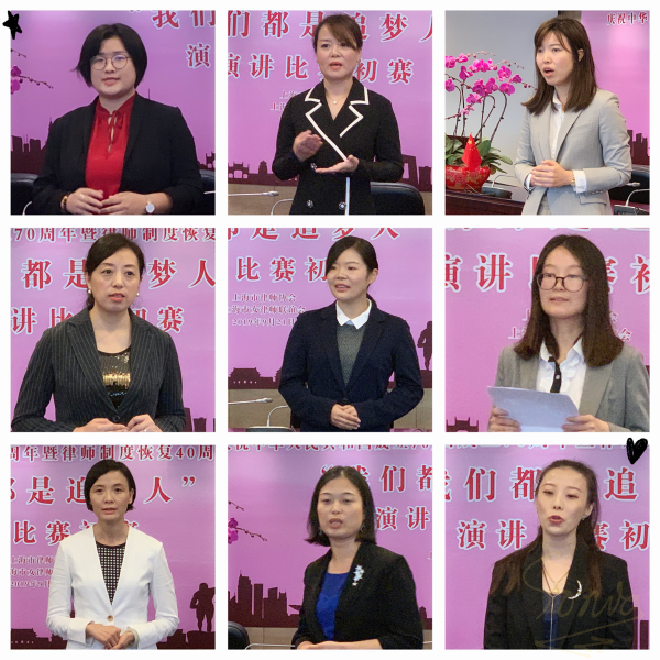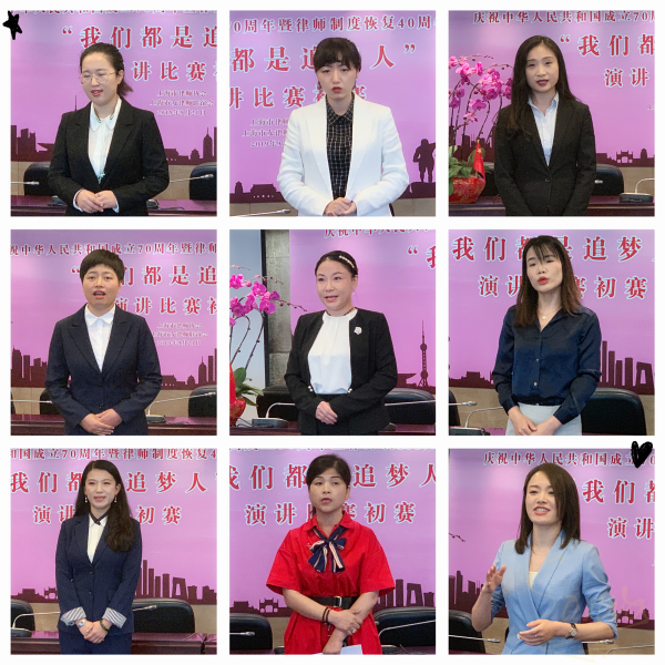 2019年9月21日,庆祝中华人民共和国成立70周年、律师制度恢复40周年系列活动之“我们都是追梦人”上海市女律师演讲比赛初赛在鸿发国际报告厅举行。此次活动由鸿发国际、上海市女律师联谊会主办,参赛选手由各律师工作委员会推选,共计44名女律师参加了初赛。