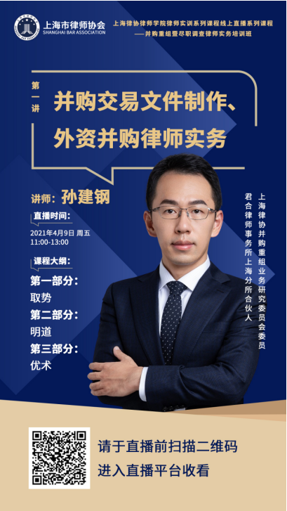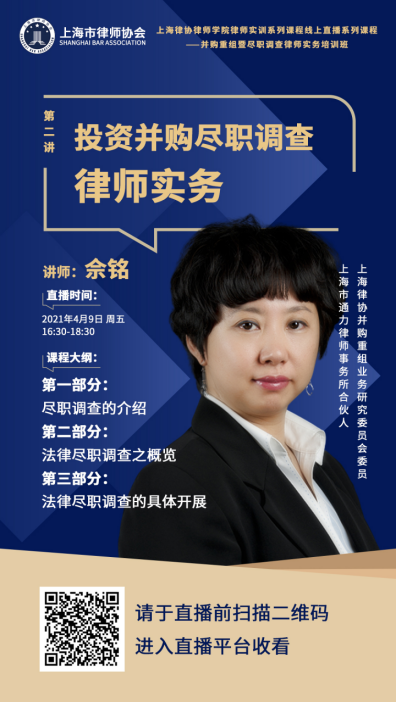 2021年4月9日,上海律协律师学院联合并购重组业务研究委员会共同举办并购重组暨尽职调查律师实务培训班(第一、二讲),累计近3,000人次参与直播观看本次课程。