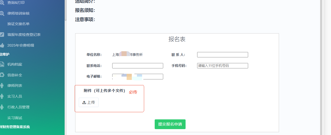 基本信息:姓名、所属律所、会员身份、联系方式、身份证号;