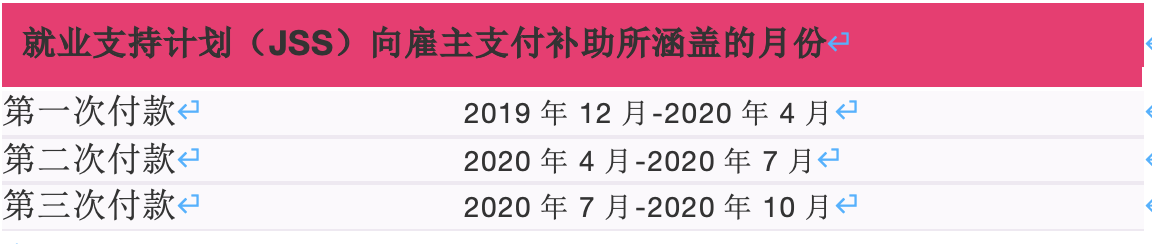 雇主将分别在2020年4月、7月和10月收到共计三笔JSS付款,如下表所示:
