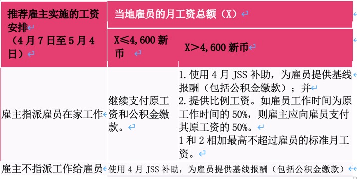此外,对于其他雇主,建议不要采取裁员或延长无薪假期的方式降低成本支出。建议雇主利用2020年4月的JSS补助(一个月工资的75%)支付阻断期间当地雇员的工资和雇主的公积金缴纳份额。