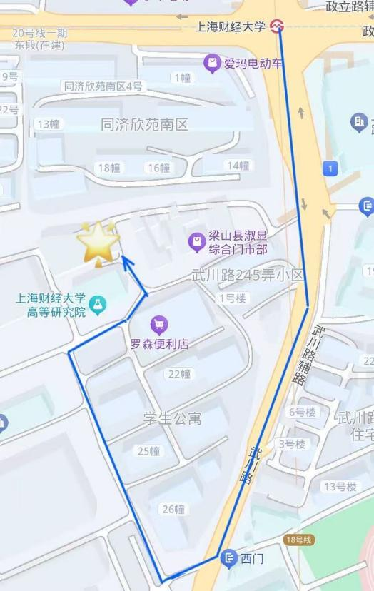 到达站:上海财经大学站,出站口:1号口步行690米10分钟至教室