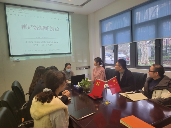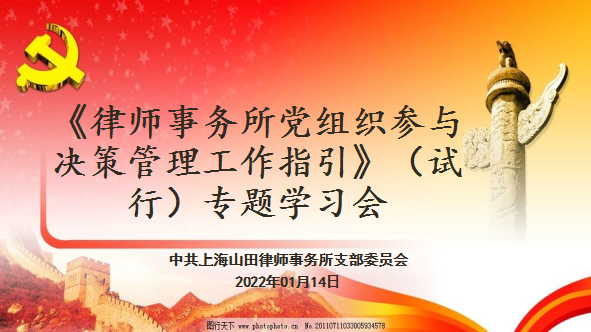 2022年1月14日山田党支部组织开展了对《律师事务所党组织参与决策管理工作指引》(试行)通知的专题学习会,会议由赵国婷同志主持,支部全体党员参与学习。