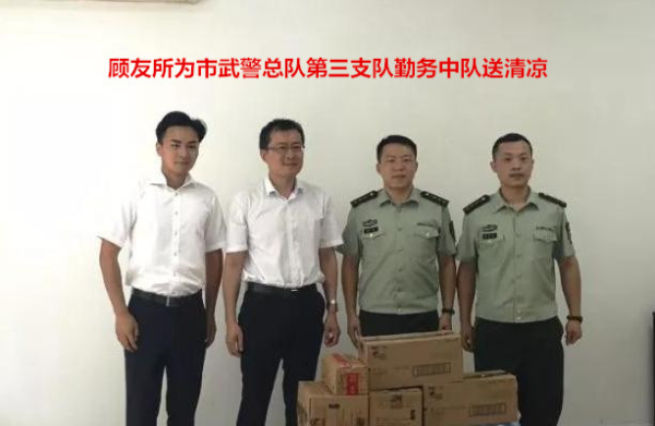 2018年7月31日,上海顾友律师事务所主任陈激扬律师、陈佳尉律师、周露霞,代表顾友所到访武警上海总队执勤第三支队驻地,在“八一”建军节来临之际,向始终坚守在保卫上海治安稳定第一线的武警官兵们表达了真挚慰问。三支队勤务中队指导员及大队长,代表全体指战员接受慰问物资并表示感谢。