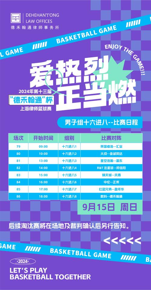 本次篮球赛不仅是对球员们身体素质和团队精神的检验,更是一次律师行业凝聚力和向心力的展示。随着小组赛的圆满结束,男子组十六进八的淘汰赛即将于9月15日(星期日)重燃战火。八强席位将花落谁家,让我们拭目以待!