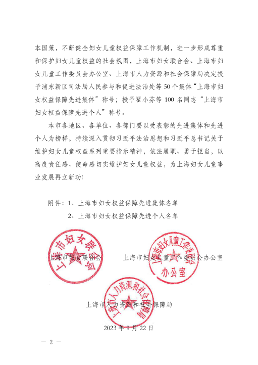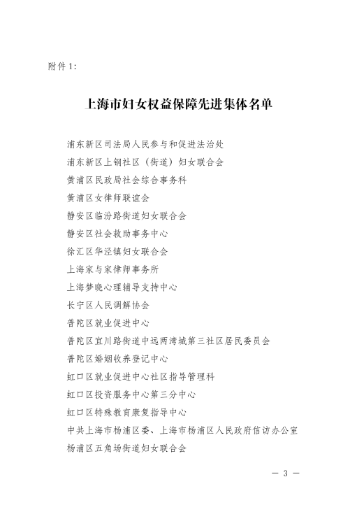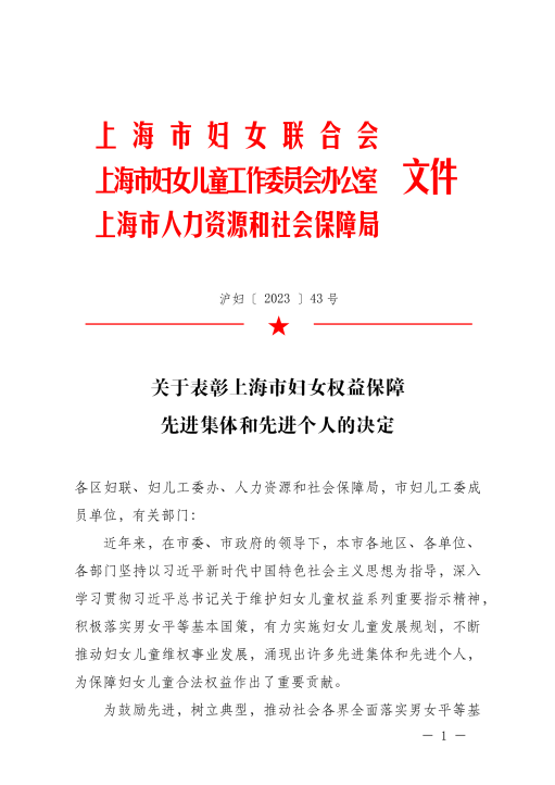 近日,在上海市妇女联合会、上海市妇女儿童工作委员会办公室、上海市人力资源和社会保障局主办的维护妇女儿童权益先进集体和先进个人评选活动中,黄浦区女律师联谊会获评“上海市妇女权益保障先进集体”荣誉称号。