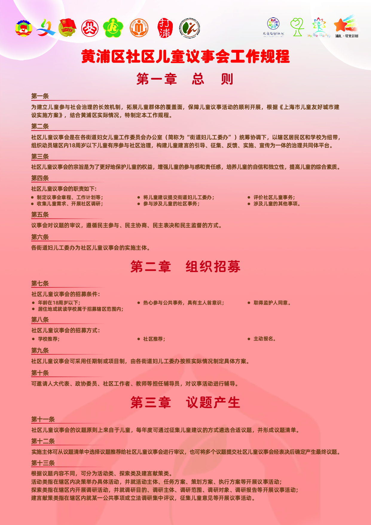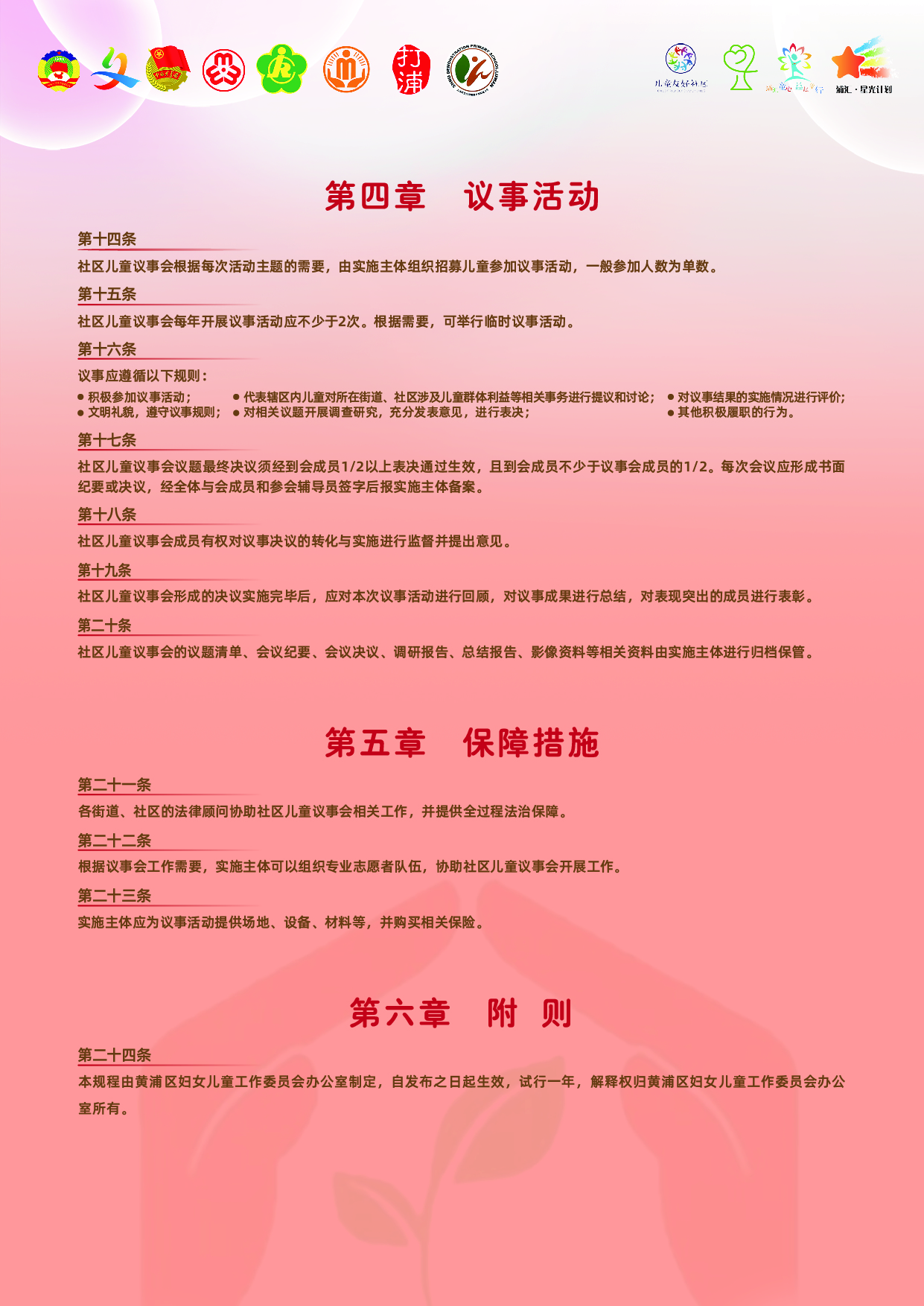 黄浦女律联为黄浦区民政局制作了《黄浦区困境儿童监护干预操作指引》;承担区妇联儿童议事会项目,制定《黄浦区社区儿童议事会工作规程》,参与辅导打浦桥街道组织开展“浦汇童邻声 ‘协’手向未来”儿童议事会活动、半淞园路街道“‘三色’半淞 ‘童’心协力”儿童议事会活动以及淮海中路街道“儿议立法”儿童议事会与街道基层立法联系点立法调研活动等。