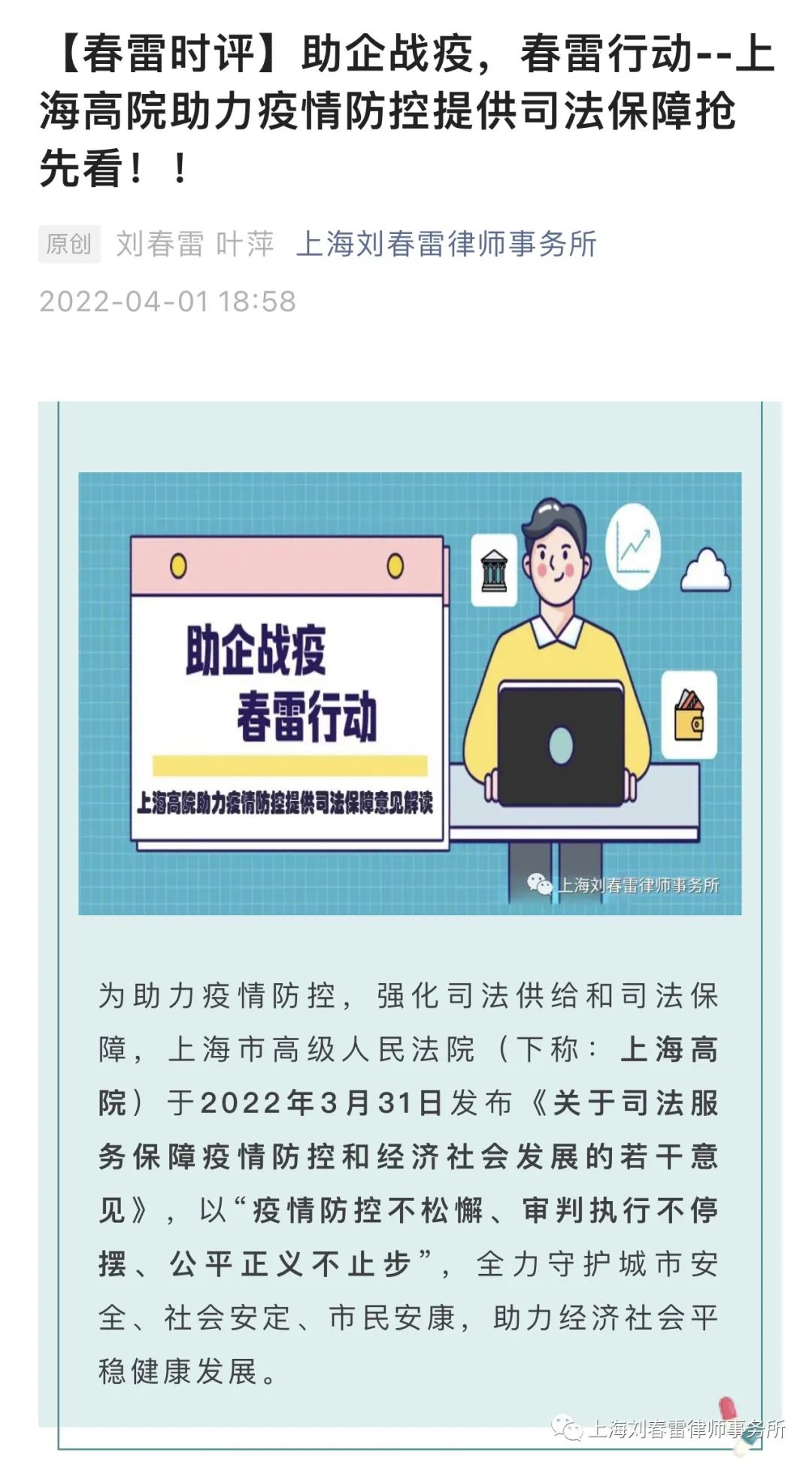 为回应社会各界对抗疫、战疫相关信息、政策法规的热切期盼,春雷所重启“助企战疫,春雷行动”,紧扣战疫政策法规、财税支持、劳动人事、涉疫纠纷处置等热点话题,加班加点编撰系列文章,通过春雷官微、春雷官网发出战疫好声音、传播正能量,深得各界好评。