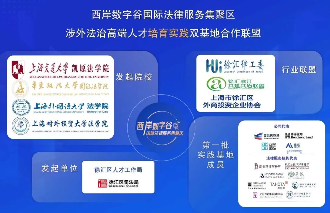 “西岸数字谷国际法律服务集聚区涉外法治高端人才培育实践双基地”由徐汇区人才工作局、徐汇区司法局与上海交通大学凯原法学院、华东政法大学国际法学院、上海外国语大学法学院、上海对外经贸大学法学院4家院校共同发起,通过合作共同推进法学教育与法律服务行业的深度融合,共同培育更多具有国际视野和实务能力的涉外法治高端人才。