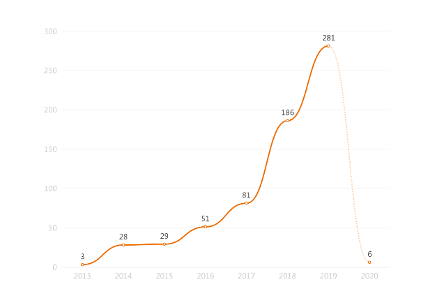 司法实践中,大量的对赌协议争议,都是在商事仲裁机构进行,限于商事仲裁案件不公开审理的原则,很多案件只是看到有律师、学者在分析,公开资料较为有限。所幸,裁判文书上网制度给我们较多的线索可供分析。通过司法裁判网检索,仅以“对赌协议”为关键词进行检索,至2020年2月已有667条记录;如以“估值调整”为关键词检索,则有301条记录。如此,仅法院公示出来的与对赌、估值调整相关的裁判案件就有近千条之多,可见关于对赌协议、估值调整条款争议还是非常大的,而且案件数量明显呈增长态势。此外,这类案件还有一个特点是原告(投资人)胜诉率高,高达82.97%。