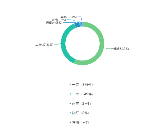 从上面右图的程序分类统计可以看到当前的审理程序分布状况。一审案件有376件,二审案件有249件,再审案件有27件,执行案件有8件。