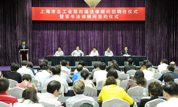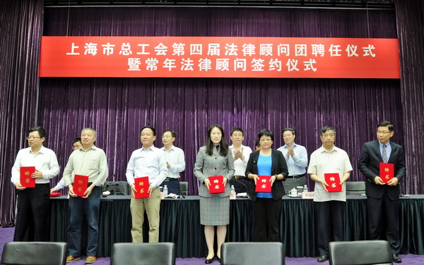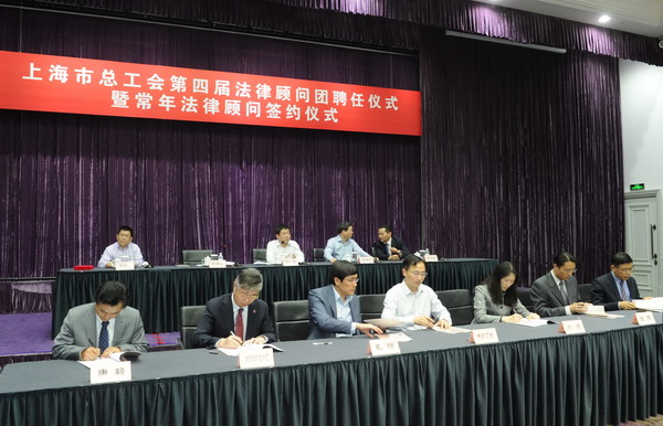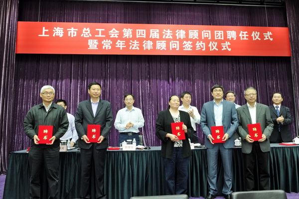5月27日下午,市总工会在海鸥饭店海泓堂举行第四届法律顾问团聘任仪式暨常年法律顾问签约仪式。15名上海律师被聘为市总工会第四届法律顾问团成员。江三角所、君悦所、金茂所、邦信阳中建中汇所、大成上海分所、唐毅所共6家律师事务所被聘为常年法律顾问。市总工会与市律师协会合作,贯彻落实党的十八届四中全会精神,充分运用专业力量和社会资源,进一步加强工会工作法治化建设所采取的一项重要举措。