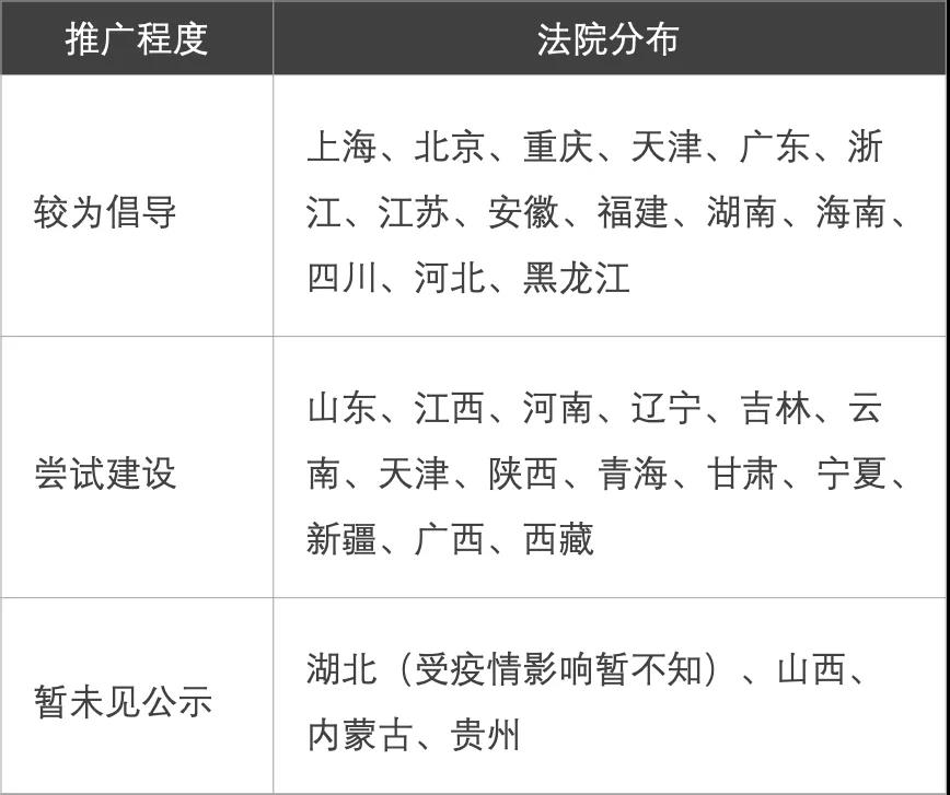 目前各地法院均根据最高院指示创建“移动微法院”小程序,以进行诉讼线上化的推广,尝试线上开庭,但根据我们目前的数据搜集,各地法院对在线庭审系统的创建、应用、推广程度不一: