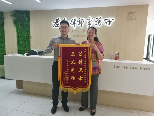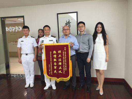 8月6日下午,长征医院政治部领导与受助女护工冯天兰女士一起来到上海市君和律师事务所,对参加此次法律援助的潘雄律师及黄浦区青年律师联谊会、上海市青年律师志愿者大队黄浦分队送上了锦旗,感谢他们在本次“法律援助进军营活动”中提供的法律帮助。