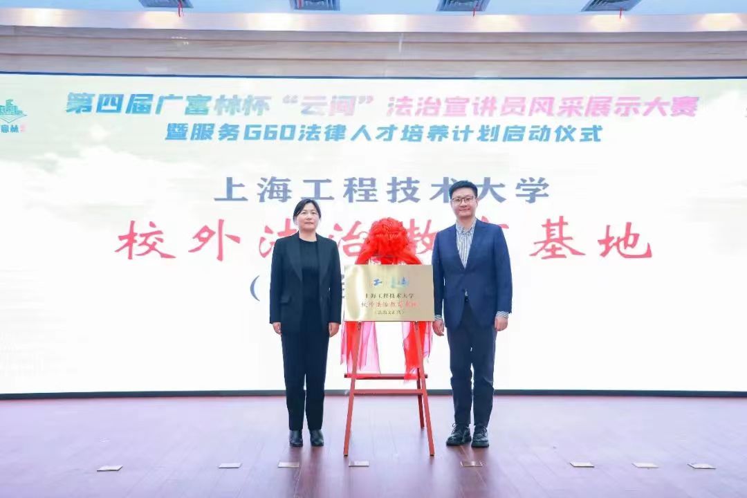 松江区司法局党组书记、局长潘琼、上海工程技术大学校长办公室主任王佳杰为上海工程技术大学校外法治教育基地(“法治文汇路”)揭牌。