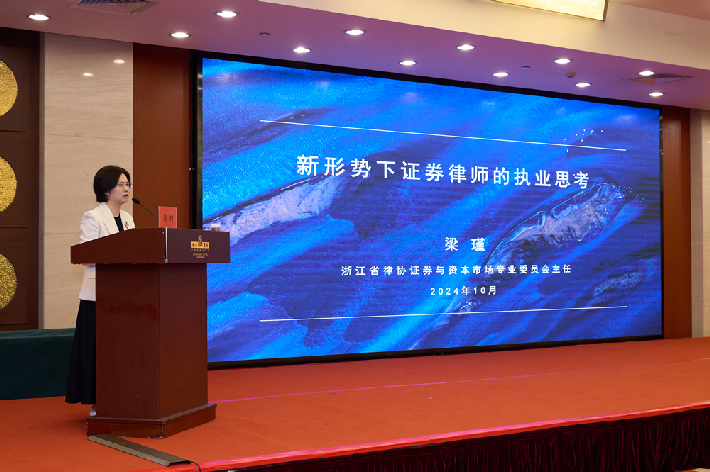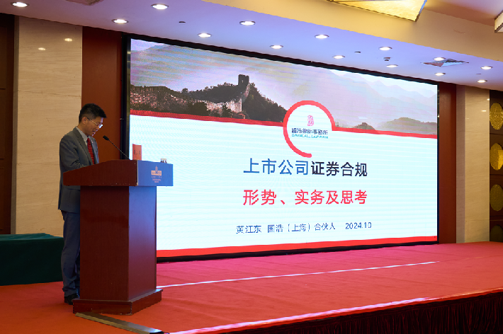 在主题分享环节,上海律协证券合规与纠纷专业委员会主任黄江东、江苏律协证券与资本市场业务委员会委员施乔、浙江律协证券与资本市场专业委员会主任梁瑾、安徽大学法学院党委书记朱庆分别以《上市公司证券合规形势、实务及思考》《基金回购退出诉讼实践》《新形势下证券律师的执业思考》和《证券中介机构责任确立的法律逻辑》为主题作了专题分享。