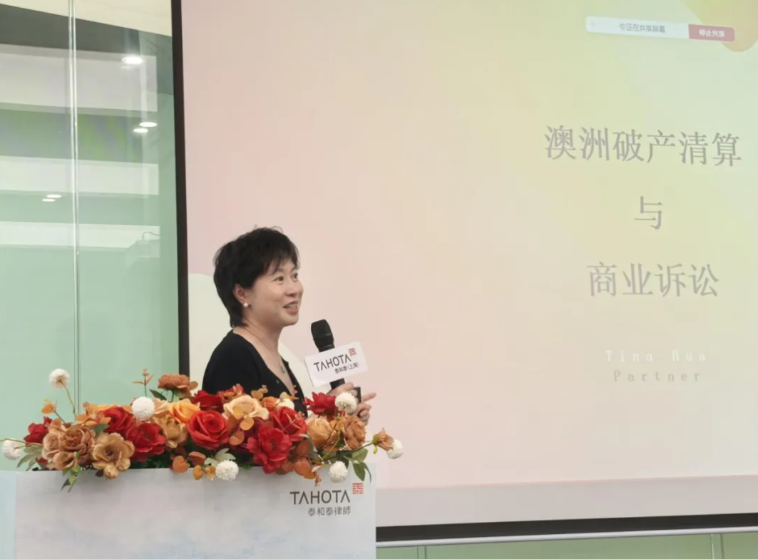 随后,泰和泰(悉尼)律师事务所执行合伙人Tina Hua律师为大家带来有关《澳洲商业诉讼、破产清算流程简介》的分享。她主要向大家介绍了澳洲的公司破产清算种类及债权人的权利,同时还向大家展示了澳洲的司法体系及商业案件的诉讼流程,中国法庭判决在澳洲的执行等,并列举了多个案例让大家清晰对比出中澳两国在司法上的异同。