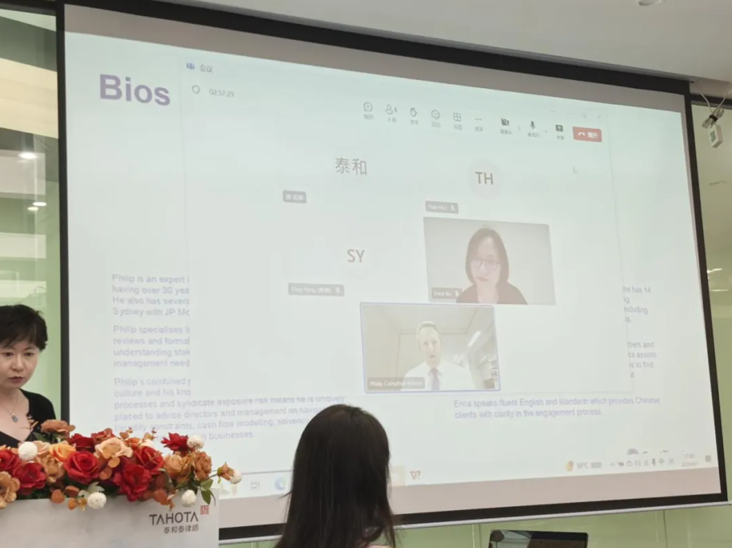 最后,来自Grant Thornton 澳洲致同合伙人Eira Xu和Philip Campbell-Wilson为大家带来有关《 澳州企业重组简介,及案例分享 》的分享。首先,Philip Campbell-Wilson 主要向大家分享了不同于中国的破产清算人角色、阐释了澳洲公司在面临资不抵债时的应对策略。随后,Eira Xu女士在致辞中对分享内容进行了补充,详细阐述了澳大利亚托管人的职责范围以及他们所享有的追诉权。她通过具体案例的列举,帮助与会者更深入地理解澳大利亚的法律体系,将抽象的法律条文转化为具体的实践案例。在讲解结束后,他们积极回应了现场嘉宾的提问,为大家提供了进一步的解答和指导。