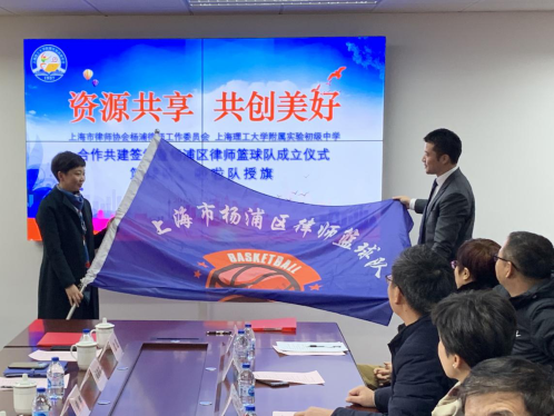 杨浦律工委副主任沈岱青律师向杨浦区律师篮球队队长齐中飞律师授予了杨浦区律师篮球队队旗,宣告杨浦区律师篮球队、啦啦队正式成立。