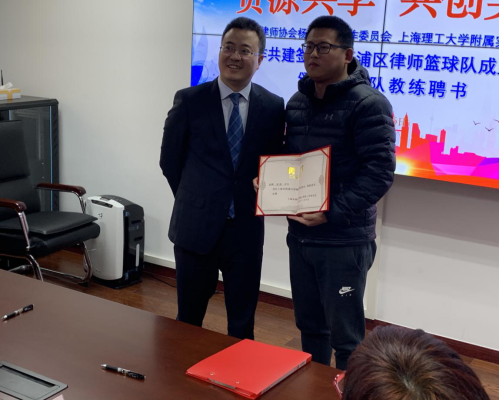 杨浦律工委委员、杨浦律工委文体与福利委主任黄超律师向上理实验沈涛老师颁发杨浦区律师篮球队教练聘书。