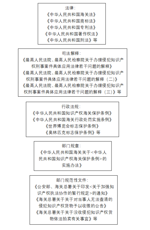 我国知识产权海关保护立法起源于二十世纪九十年代中期,经过这些年的发展,已形成法律、行政法规、部门规章、规范性文件等较为完善的法律体系,如下图所示: