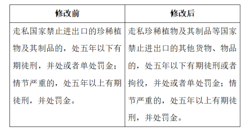 根据《刑法修正案(七)》,最高人民法院、最高人民检察院发布《关于执行<中华人民共和国刑法>确定罪名的补充规定(四)》(法释〔2009〕13号),将原“走私珍稀植物、珍稀植物制品罪”修改为“走私国家禁止进出口的货物、物品罪”。