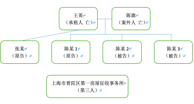 一审法院认为,根据陈某3与上海市普陀第一房屋征收服务事务所有限公司签订的征收补偿协议的内容,系争房屋被依法征收,征收补偿利益应当由房屋的承租人和共同居住人共有。系争房屋承租人登记为王英。在王英死亡后,承租人亦未进行过变更登记,至上述征收决定开始实施后承租人仍登记为王英。根据规定,在征收决定作出之日,系争房屋内的同住人必须符合以下条件:在房屋内有本市常住户籍、在房屋内居住满一年之上、他处无房或者虽有房屋但居住困难的。双方当事人在审理中,对各自户籍的登记情况均无异议,在征收实施时系争房屋内仅有陈某3一人户籍在内,张某、陈某1、陈某2的户籍均登记在他处,因此张某、陈某1及陈某2均非系争房屋的同住人。陈某3虽然户籍登记在内,但自2003年起即不在系争房屋内居住,陈某3称系因身体原因需要女儿照顾故至外地居住,故仍应属系争房屋同住人的抗辩主张,因其所主张的居住原因并非法定在他处居住仍构成系争房屋同住人的事由,故对陈某3的该抗辩主张,一审法院不予采纳,陈某3亦非系争房屋的同住人。公有住房的所有权属于国有单位,因国家政策进行调配租赁,相对方仅获得房屋的承租权,拥有占有、使用、收益的权利,公有住房的承租权并不具备遗产的属性,意即系争房屋并非王英的遗产。因此,张某、陈某1称系争房屋的征收补偿利益已经转化为王英的遗产,缺乏法律依据,一审法院难以支持。然,关于系争房屋的征收补偿协议已经签署,相关当事人对该协议均未提出无效或者撤销的主张,故征收补偿利益应当由被征收人享有。基于王英已经死亡的事实,征收补偿利益应当归属于同住人,由于系争房屋不具有符合条件的同住人,因此,陈某3、陈某2称该征收利益应归属于陈某3一人所有的抗辩主张,同样不符合法律规定,一审法院亦不予采纳。鉴于征收补偿利益已经客观生成,各方当事人对此利益本身并不存有异议的基础,一审法院根据系争房屋内的户籍及户籍迁入、迁出之演变、张某、陈某3等四人在本市拥有住房等实际情况,依法酌情予以分割。陈某3为系争房屋内唯一户籍登记在册人员,根据相关规定,在王英死亡后,如若系争房屋再行指定承租人,也仅陈某3一人具有被指定的可能性,加上陈某3在本市并无住房,因此陈某3应当分配得到的征收补偿利益应当高于张某、陈某1等人。陈某2之女王某某的户籍本在系争房屋内,在王某某生育子女之际,因张某的原因导致王某某户籍被迫迁出,因此陈某3在获得征收补偿利益后向王某某作出的承诺系陈某3就户籍纠纷采用的积极解决问题的做法,意即如果王某某的户籍仍旧在系争房屋内,王某某将与陈某3具有同样的身份,因此陈某3通过转账方式给予陈某2的部分补偿利益并无不妥,一审法院予以准许。张某、陈某1均因本人或者家属的工作单位调配,享受过本市的福利分房政策,属于他处有房,且他们的户籍早已迁出房屋达数十年之久,因此他们获得征收补偿利益应当小于陈某3。至于陈某3称他们为非同住人不应获得征收补偿利益的抗辩主张,因系争房屋在征收补偿时并无实际同住人的特殊情况,且系争房屋获得时张某、陈某1亦均为原始受配人,故一审法院对陈某3的上述抗辩主张不予采纳。