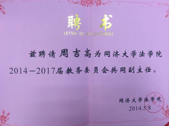 同时,上海建领城达律师事务所主任周吉高律师被同济大学法学院聘请为2014-2017届教务委员会委员、副主任,并参加了当天的教务委员会会议。