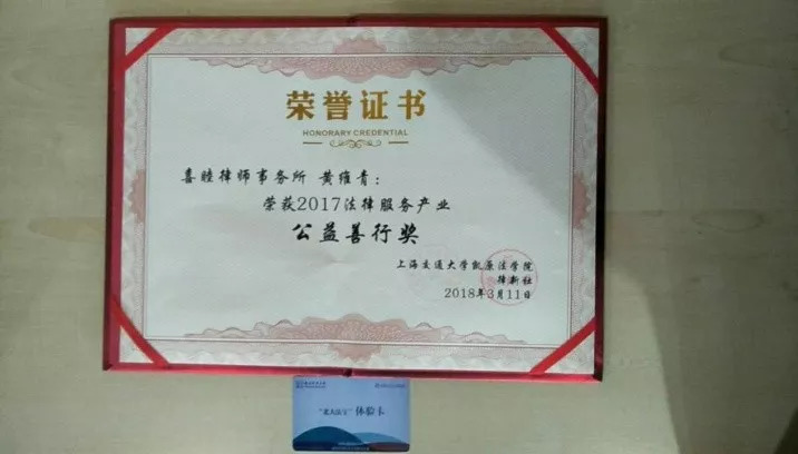 2018年3月,黄维青律师获得中国法律服务产业十大感动公益故事“公益善行奖”。