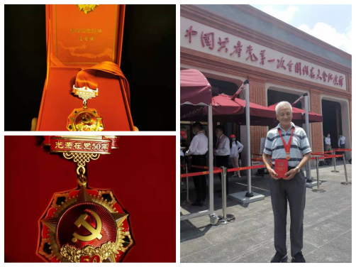 党支部靳新用同志作为党龄超过50年的老同志,此次还携带了“光荣在党50年”纪念奖章专门在纪念馆合影留念。他激动的表示,能够在党生日前一天参观留影是非常具有纪念意义的事情。