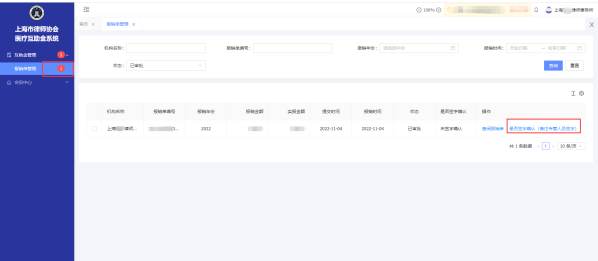 报销单管理中的数字标1:表示有待办事项1条,有1条市律协已审核通过的报销单需要律师事务所专管人员选择是否需要律协代签字确认。