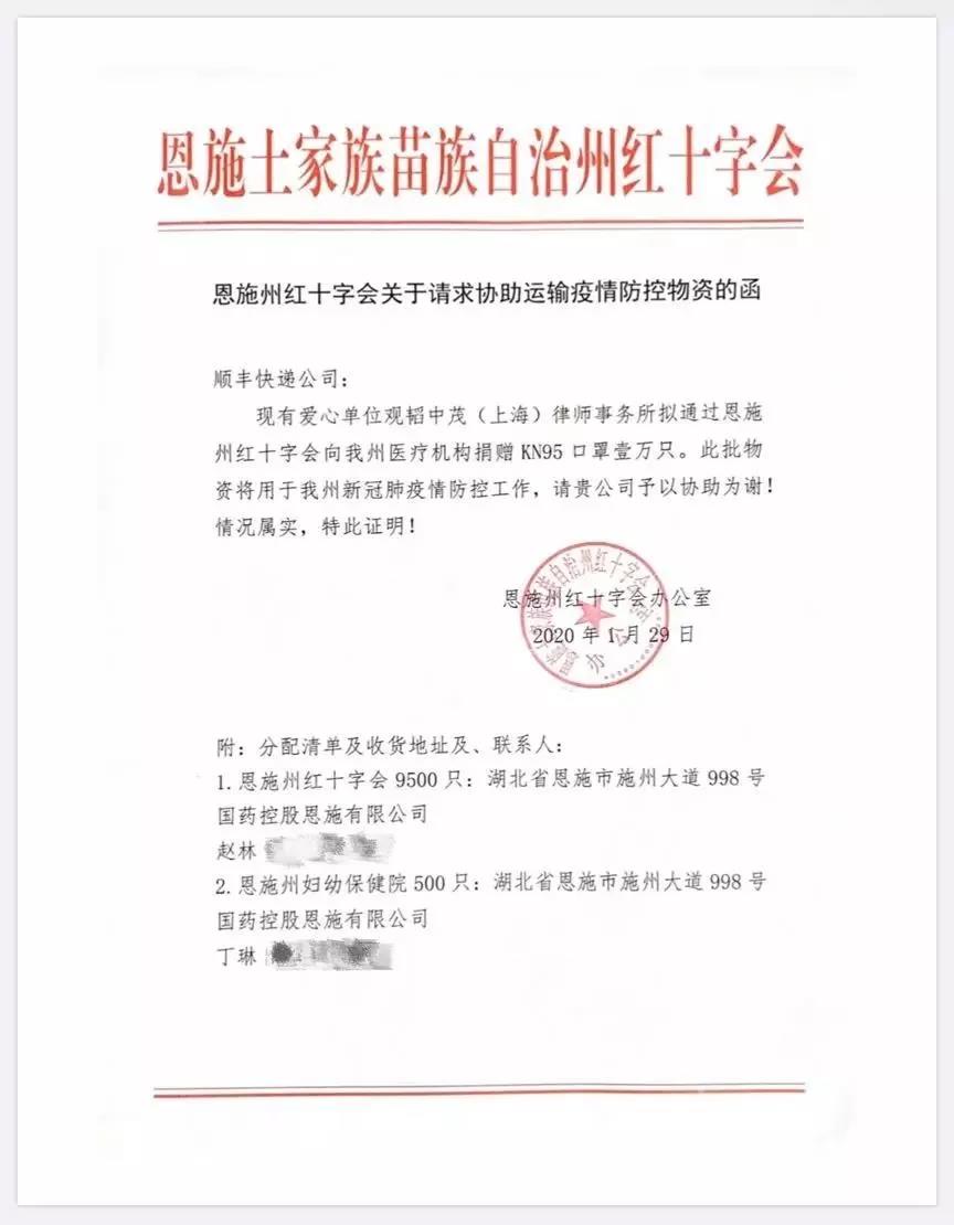 湖北各地防疫物资全线告急,包括恩施、黄冈、宜昌、襄阳等在内的许多市、州、县医疗机构都向社会发出了求助公告,请求支援。1月28日,观韬中茂上海办公室通过各种办法,采购到KN95口罩1万只,并迅速通过恩施州红十字会,向当地医疗机构和疫区公众进行捐赠,用于湖北恩施的疫情防控工作。