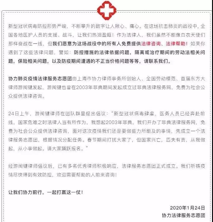 上海市协力律师事务所在抗击疫情期间全面上线了微信、微博法律咨询渠道。由市律协理事、上海市协力律师事务所创始人游闽键律师牵头组成的疫情法律服务志愿团在线上就隔离或治疗期间的劳动法相关问题,保险相关问题,以及防疫期间遭遇的不正当价格等问题为人民群众进行解答,为抗击疫情积极提供法律支援。