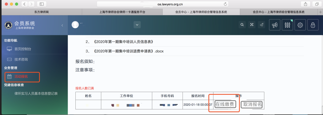 (一)打开东方律师网,点击会员登录,使用实习证号和密码登录后进入会员中心,点击报名缴费: