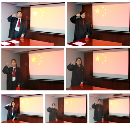 宣誓仪式由党支部书记叶萍律师领誓,由党支部副书记刘春雷律师监誓。叶萍律师左手抚按《中华人民共和国宪法》,右手举拳,领诵誓词。参与人员端庄伫立,神情坚定,与领誓人一同面向国旗庄严宣誓----