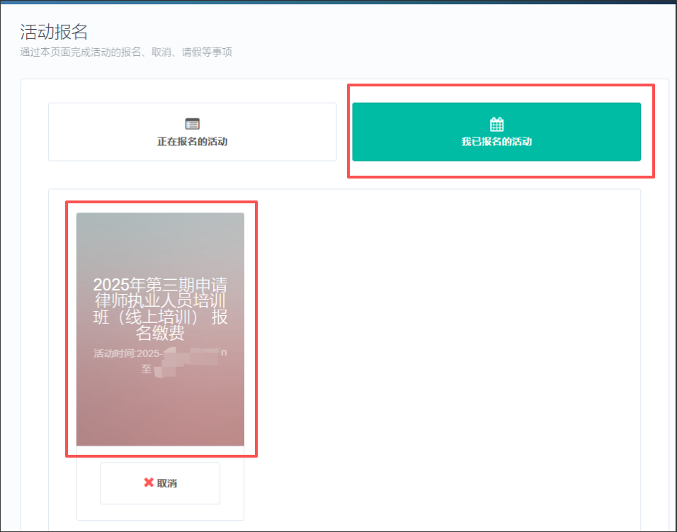 4.点击“已报名活动”,选择“2025年第三期申请律师执业人员培训班”,点击“缴费”;