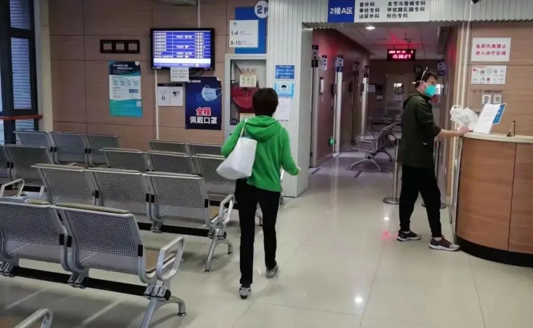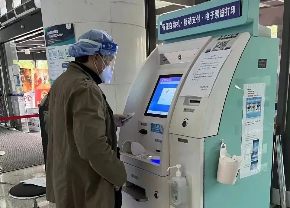到达医院后,需按要求扫场所码方可进入医院,为防止志愿者将病毒带入医院,我们身上的防护装备需全部脱下。经再次扫码、量体温进入大厅后,我们每人负责一摞居民医保卡,按分工各自直奔挂号机器完成挂号支付。