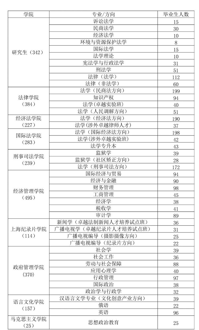 我校2020届毕业生共计2636人,其中硕士毕业生342人;本科毕业生2294人,涉及法学、监狱学、国际经济与贸易、社会学、新闻学、行政管理、英语等30多个专业或方向。就业去向主要有:国家机关、事业单位、公司企业、金融机构、社会服务机构等。