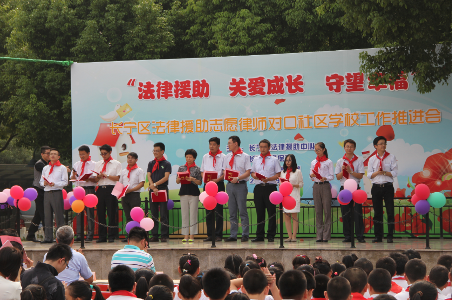 9 月4日 下午,长宁区法律援助中心在绿苑小学召开“法律援助关爱成长 守望幸福”为主题的法律援助志愿律师对结社区学校工作推进会,会上明确了由新华、天驰洪范、君悦、广东国晖、海华永泰、城大、御宗、海耀、欣宏、公誉、养和、炜衡、中大、新沪、瑞富、凯茂16家律师事务所的20名律师对接10个街道社区和83个中小学、幼儿园。推进会在市法律援助中心副主任张铭、区教育局副局长吴玉雷、区司法局副调研员李为清、长宁区律工委主任刘习赟四人按动启动球拉开了帷幕。志愿律师在会上做了郑重承诺;市法律援助中心副主任张铭和区司法局副调研员李为清做了讲话。