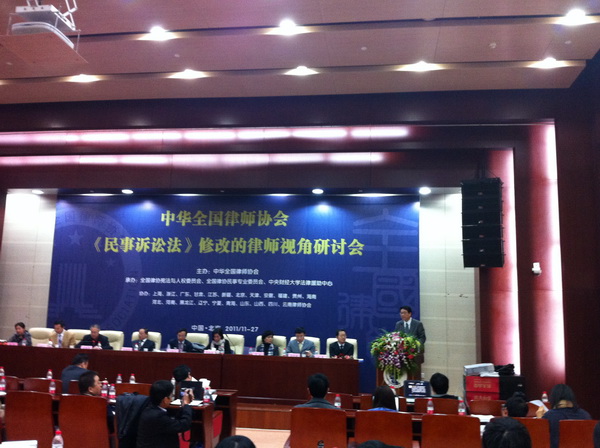 2011年11月27日,鸿发国际民事业务研究委员会主任谭芳律师、副主任竺建平律师、劳动法业务研究委员会主任陆胤律师代表上海律师赴北京中央财经大学,参加了由中华全国律师协会主办、全国律协宪法与人权委员会、全国律协民事专业委员会承办的“《民事诉讼法》修改的律师视角”研讨盛会。来自全国22个省、自治区、直辖市约200名律师代表及委员参会。