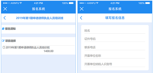 2、正式登陆后,选择缴费项目“2019年第1期申请律师执业人员培训班”。