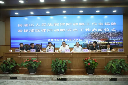 8月30日下午,上海市律师调解试点工作在杨浦首先启动,21名律师受聘成为首批律师调解员,此举标志着法律专业力量融入矛盾纠纷多元化解机制在杨浦区率先得到实践。市高院副院长张斌、市司法局副局长王协、副区长李雅平、区法院院长任湧飞、区司法局党委书记、局长陆静出席了启动仪式。