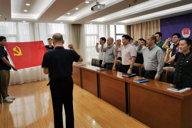 7月1日,在区司法局机关党支部书记何榕军的带领下,全体党员干部佩戴党徽、面向党旗、举起右拳、共同宣誓: