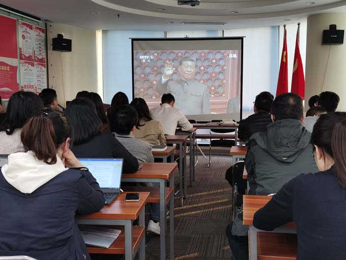 此外,全体党员在会议期间又重温了近平总书记在庆祝中华人民共和国成立70周年大会上的讲话和阅兵式的视频资料。大渡河连、平型关大战突击连、海上先锋艇、神威导弹营……一面面铁血战旗,一支支英雄部队,承载着人民军队的光荣与梦想,看得大家心潮澎湃,无比激动。回望一百年前千疮百孔的旧中国,对比如今繁荣富强的新中国,如果没有那些青春激昂的身影抛头颅、洒热血,没有一代一代的青年追随党的旗帜,又哪里会有我们今天平安幸福的生活。正如人们常说的:“哪有什么岁月静好,只是有人为我们负重前行”。