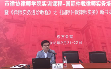 2018年9月21日,市律协律师学院联合国际贸易业务研究委员会、海事海商业务研究委员会共同举办的国际商事仲裁律师实务培训班暨《律师实务进阶教程》之《国际商事仲裁律师实务》新书发布会在交通大学凯原法学院二楼东方会堂举行。《国际商事仲裁律师实务》作为律师学院进阶教程系列第五本教材已于2018年6月出版。