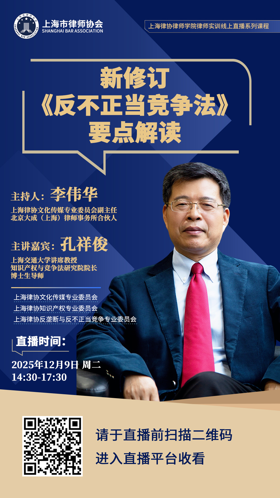 十四届全国人大常委会第十六次会议于6月27日表决通过新修订的反不正当竞争法,自2025年10月15日起施行。本次修法不仅直面平台 “内卷式” 竞争、大型企业拖欠中小企业账款等痛点,还对关键词搜索、侵害数据权益、虚假交易等不正当竞争行为的认定标准予以细化。在数字经济蓬勃发展、市场竞争日趋复杂的当下,此次修订意义重大。对此,上海律协文化传媒专业委员会、反垄断与反不正当竞争专业委员会、知识产权专业委员会联合举办“新修订《反不正当竞争法》要点解读”讲座,邀请上海交通大学孔祥俊教授主讲,具体安排如下: